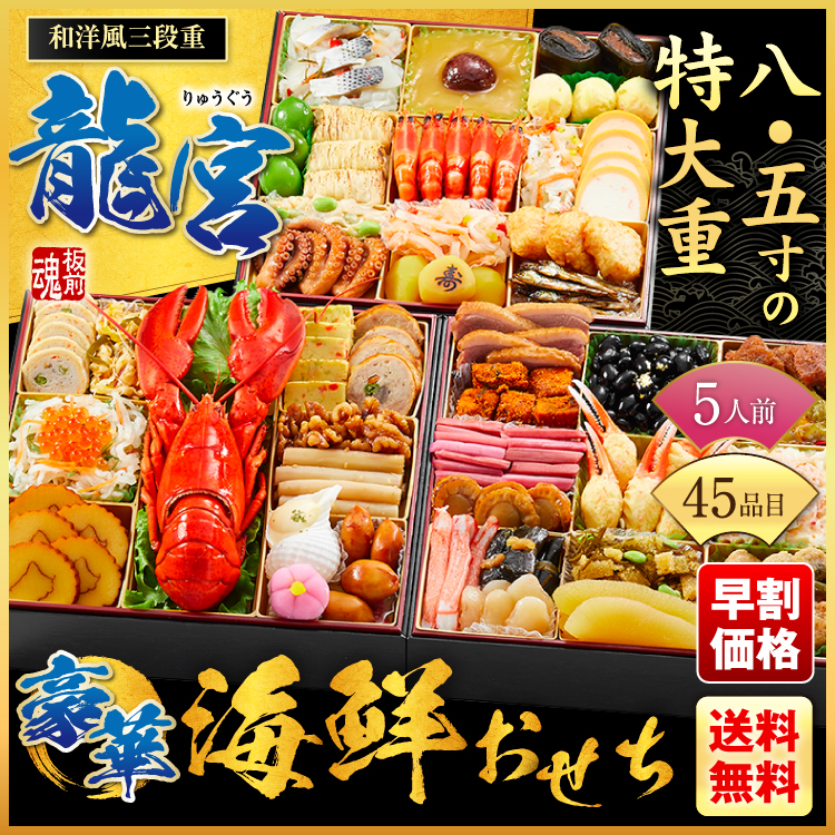テレビや新聞でも話題の板前魂の有名芸能人絶賛おせち2025 板前魂の龍宮 8.5寸特大サイズ和洋風三段重海鮮おせち料理 5人前 45品目【送料無料】【2025】【おせち お節 御節】(りゅうぐう)を売り切れ前に予約するには